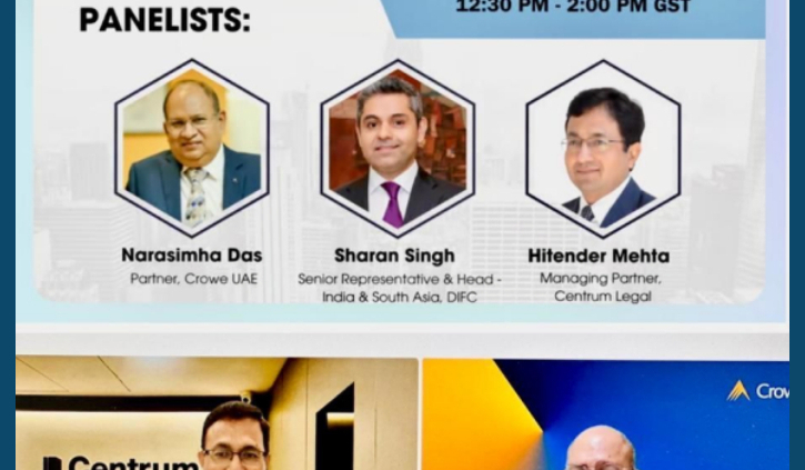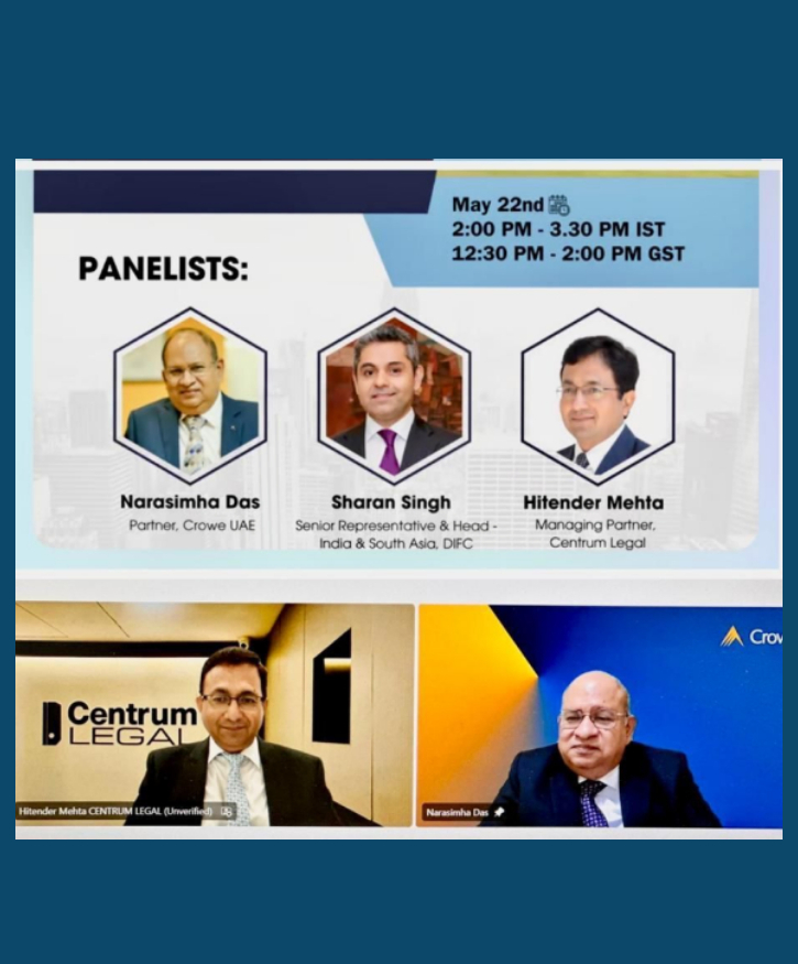 Mr. Hitender Mehta, Managing Partner, Centrum Legal addressed an international webinar on the topic “DIFC: A Gateway for Indian Wealth & Asset Management Businesses” jointly hosted by #DIFC (Dubai International Financial Centre) and #Crowe UAE (a firm of international repute into audit, tax, advisory and risk services) on 22nd May 2024. The webinar was also addressed by eminent Co-Panelists Mr. Sharan Singh, Senior Representative & Head – India & South Asia, DIFC, Mr. Narasimha Das, Senior Partner, Crowe UAE. Spotlight was on investment opportunities in India and outside India (inbound and outbound investment) through #FDI, #FVCI, #FPI and #AIF modes.